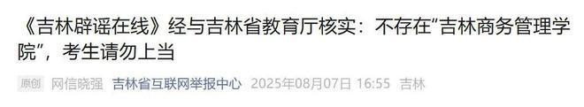 8月7日手机炒股配资平台,吉林省互联网举报中心微信公众号发布消息,《吉林辟谣在线》经与吉林省教育厅核实:不存在“吉林商务管理学院”,考生请勿上当。
